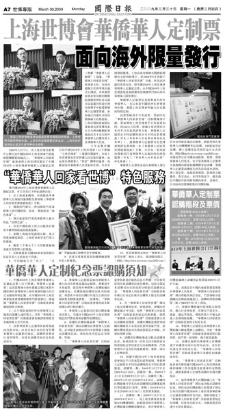 中新网4月8日电 《国际日报》3月30日刊登世博专版,介绍上海世博会华侨华人定制纪念票。
