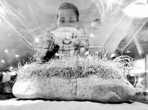 一块长满“白发”的石头,近日亮相上海海洋水族馆,落户“生物进化科普展”。石头的“毛发”是一种名为头盘虫的原始海生动物。头盘虫长30至40厘米,身体构造为含甲壳素的纤细管状体,以微小生物为食。上海世博会布展将挑选百块“世博极品石”,“白发石头”是被选中的一块。孙中钦 摄影报道