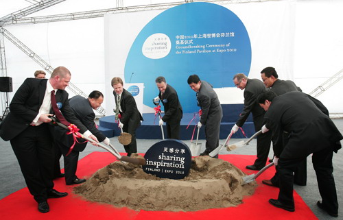 4月22日下午,上海世博会芬兰国家馆“冰壶”的奠基仪式在世博园区举行,一块“冰壶”状的奠基石被埋入了芬兰馆的地基中,将和拔地而起的“冰壶”一起诚邀中外嘉宾前往芬兰馆“分享灵感”。芬兰就业与经济部长毛里·佩卡里宁、上海市人民政府副秘书长、上海世博会事务协调局局长洪浩和2010年上海世博会芬兰政府总代表胡毅督等出席了奠基仪式。(胡敏)
