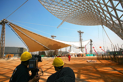 中新网4月30日电 据上海世博会官方网站消息,今天,世博轴上首批两个喇叭状的阳光谷正式落成,同时顶棚膜结构张拉启动,这标志着世博轴上部主体工程即将全面完工。上海世博会执委会专职副主任钟燕群、上海世博局副局长丁浩等出席仪式。钟燕群宣布启动世博轴顶棚膜结构张拉。