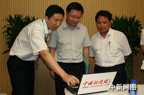 6月18日,上海世博局副局长朱咏雷(中),上海市网宣办副主任谢海光(右)观看中新世博在线页面,并给予高度评价。吴博 摄