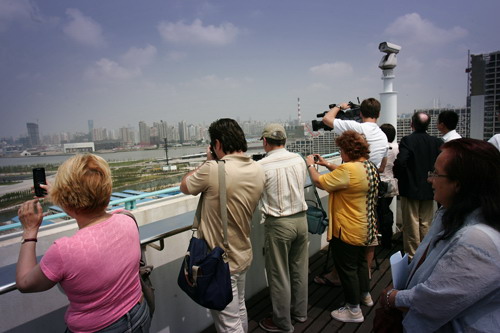 记者们兴致勃勃地参观了世博规划展示厅,并登上世博大厦顶楼俯瞰世博园区,还进入园区拍摄了中国馆的建设情况。在观看了上海世博会宣传片后,记者们就上海世博会的筹备进展、场馆投资和运作等情况采访了世博局新闻宣传部负责人。阿尔巴尼亚Top Channel电视台的记者还专门询问了阿尔巴尼亚的参展情况。