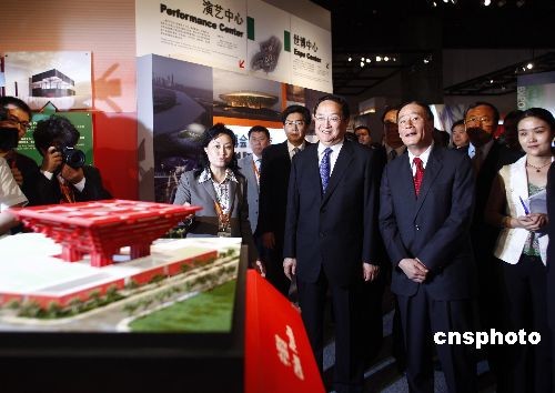 7月5日,上海世博会倒计时300天之际,由世博会组委会主办的“走进世博会”大型展览在北京首都博物馆开幕,国务院副总理王岐山、上海市委书记俞正声等出席启动仪式。本次展览汇集了最全面的上海世博会筹办进展资料,其中首次亮相的59个展馆实物模型、中国馆“万花筒”、张艺谋团队最新制作的世博园虚拟电影,是本次展览会的亮点。中新社发 郑雄增 摄