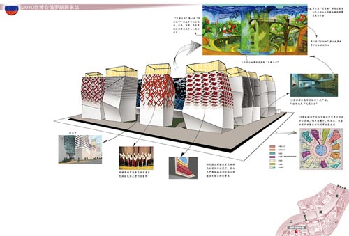 俄罗斯馆占地6000平方米,是世博会最大的展馆之一。它的外围是12座不规则形状的塔楼,耸立于草坪和水景之间,塑造出俄罗斯馆传统与现代相结合的外形。