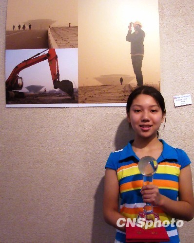 2009年8月12日,首届“世博印象——上海市民数码摄影大赛”在上海徐汇艺术馆公开展出。15岁的小姑娘沈晶茹以组照《世博风采》获最具潜质奖,这是三张拍摄于世博工地的照片。中新社发 井韦 摄