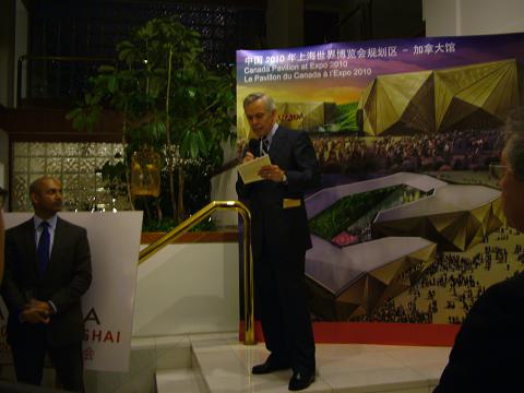 加拿大驻华大使马大维今晚举行招待会,庆祝加拿大参展2010上海世博会。2010上海世博会加拿大总代表马克•罗斯韦尔(艺名“大山”)介绍相关情况,他说,加拿大重视上海世博会,参展准备进展迅速。