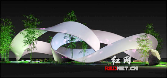 (三)彰显湖湘文化,突出湖南元素。展馆的设计形象湖南色彩浓厚,竹、纸、芙蓉花、桃花源、武陵源概念等湖南元素以及蔡伦造纸、隆平水稻、白石艺术、毛泽东故事等湖湘人文形象贯穿整个设计。环体主体材料为竹结构,且整个场馆掩映于竹林碧水之间,竹使人联想起湘妃竹、潇湘竹海和毛主席的诗句。整个魔比思环就像展开的卷轴,环体外表用纸装饰,纸是中国古代四大发明之一,湘人蔡伦造纸,体现了湖南历来有重视教育科技创新的传统。芙蓉花代表湖南自然、绿色形象。还有怀素的草书、齐白石和黄永玉的画,体现出湖南人对自然的膜拜、对美的执着追求。馆名“桃花源里·Xanadu”更是显现了桃花源的概念和世人对“世外桃源”的千年寻梦。并用这些浓厚的湖南元素设计组合,烘托出毛泽东诗句中的“万类霜天竞自由”、“桃花源里可耕田”、“芙蓉国里尽朝晖”的伟大浪漫主义情怀,把“都市桃花源”的理想境界推广到全世界。