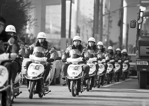 小东门派出所结合“平安世博”社区防范巡逻工作,今天上午10时许,10辆装有警用爆闪灯的电动自行车开始在黄浦区小东门地区进行首次巡逻。(张龙 赵齐)