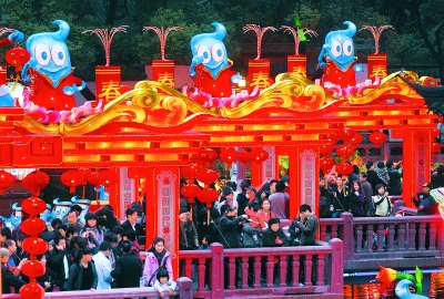 元宵灯会前夕,由中国馆、海宝等“世博花灯”装扮的豫园九曲桥人山人海。