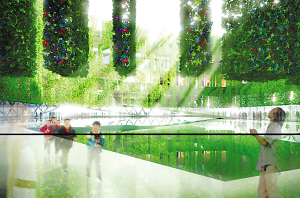 “建筑内部的绿色立体园林,也使用了可降解、可循环的材料,以尽可能达到最大限度的环保。这些绿色的植物,除了可以让人们亲近自然,还能够帮助调节室内温度,让参观者更加舒适。屋顶的太阳能电池板,则提供了清洁而免费的能源。”方可说。