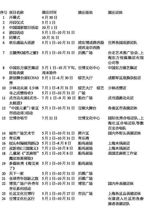 上海世博会期间,世界各地表演团体将带来2万多场文艺演出和活动。由东道主组织的19项盛大演出也已准备就绪,开幕第一天起陆续在世博园全新的文化中心、综艺大厅、综艺广场、后滩广场、船台广场、宝钢大舞台、育乐湾、船坞剧场、博览广场、市民广场一一亮相,生动演绎各国传统和文化,盛情邀请各国来宾分享和互动——