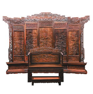 海南国盛古典家具的吴先生自2008年底便着手策划创作此屏风,后集中35位工艺大师制作出作品。吴先生介绍,屏风所用材料是从50多吨老挝大红酸枝中精选出,树龄达数百年,质如温玉,色泽厚重。