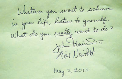 对于石油的明天,奈斯比特夫人说,“我们认为,解决方式不应局限于解决事物本身,而应着眼于寻找新的机会。”奈斯比特先生进一步阐释,“人类不能找到更多的石油,却可以不断研发出新的替代能源,如电能、氢能。这些不同形式的能源将融合一段时间,然后其中一部分将逐渐超越另一部分。”