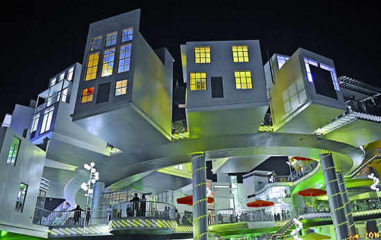 很多场馆在设计时,就考虑了夜间效果,用灯光展示场馆的另一面。浦东园区“灯光秀”的主打阵地是“一轴四馆”。要欣赏夜景,首选地是世博文化中心:白天,它是洁白的巨型飞碟;夜晚,它变身神秘的“浮游都市”。