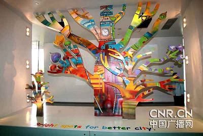 讲解员说这些东西取材于俄罗斯全国儿童绘画大赛的获奖作品,他们共同的主题是《我眼中的最佳城市》:一座座房子盖在乌龟上,城市可以移动;有的树上也盖了房子,张开的树枝就是一条条马路。孩子们心中的未来城市真是充满了想象力和童趣,这样的设计也受到了正在参观的孩子们的喜欢。