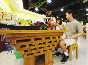 来自美国休斯敦的青年盖瑞,携女友一起进入世博园区的世博文化中心后,被一股清香甘醇的茶香所吸引,一脚踏进了设在这里的帝芙特国际茶文化园内。“中国茶口感真好,包装造型也很时尚,我很喜欢。”在品尝了天台山云雾茶等几款茶水后,盖瑞表示要把上海茶带回美国,让家人和朋友分享!