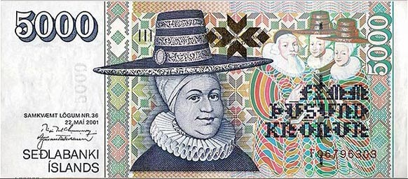 参与互动(0)冰岛克朗是冰岛的官方货币,在冰岛语中是“皇冠”的意思,纸币面额有100克朗、500克朗、1000克朗、2000克朗以及5000克朗等。其中5000克朗面值的纸币上的人物是拉格希尔-荣斯蒂尔(1646年-1715年),她曾是两位冰岛主教的妻子,还是一位著名的裁缝。纸币背面是荣斯蒂尔正在教两名学生学习的情景。