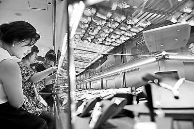 近日,受国际金价持续走高影响,国内金饰价格一路上涨,千足金价格接近每克450元。随着市场进入传统“金九银十”的黄金饰品消费高峰期,金饰品市场迎来消费旺季。图为在宁夏银川市一家商场,顾客在选购黄金饰品。