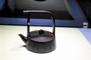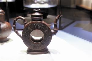 据张定珍介绍,本次展出的紫砂泰斗顾景舟的“鹧鸪提梁壶”,壶的造型为扁圆形,把手为见棱见方的三柱高提梁,从侧面望去犹如一只飞翔着的鸟儿的头部,壶本身的艺术水平很高。