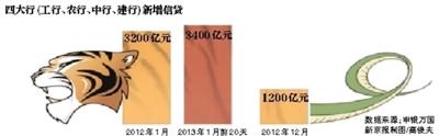 1月份一直是银行放贷高峰期。申银万国数据显示,四大行(工行、农行、中行、建行)1月前20天的新增信贷为3400亿元,较2012年12月的1200亿元增长近两倍,超过2012年1月四大行全月的3200亿元新增信贷水平。