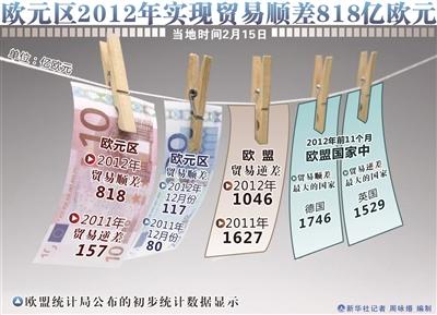 欧盟统计局2月15日公布的第一次预估数据显示,欧元区2012年的外贸顺差为818亿欧元,与2011年157亿欧元的外贸逆差相比出现明显好转;欧盟2012年的外贸逆差为1046亿欧元,大大低于2011年1627亿欧元。统计数据表明,欧元区和欧盟的外贸状况均出现不同程度改善,对华对日贸易逆差继续减少。