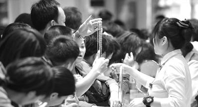 5月2日,顾客在北京菜百公司选购黄金饰品。黄金价格的下跌刺激了国内消费者的购买欲望。“五一”小长假期间,北京菜市口百货股份有限公司销售额达2亿元,同比增长超过30%。