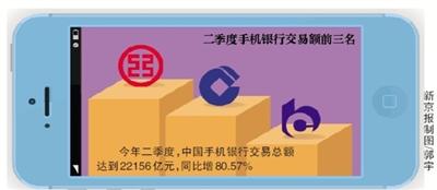 易观国际最新发布的报告显示,今年第二季度,中国手机银行交易总额达到22156亿元,同比增长80.57%,其中工行、建行、交行位列中国手机银行交易额前三名。