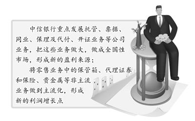 朱小黄举例,比如中信银行重点发展托管、票据、同业、保理及代付、开证业务等公司业务,把这些业务做大,做成全国性市场,形成新的盈利来源;以及将零售业务中的保管箱、代理证券和保险、贵金属等非主流业务,做到主流化,形成新的利润增长点。