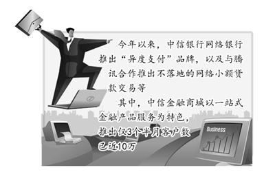 基于此,今年以来,中信银行网络银行新招频出,包括推出“异度支付”品牌,以及与腾讯合作推出不落地的网络小额贷款交易等。其中,中信金融商城以一站式金融产品服务为特色,推出仅3个半月客户数已近10万。