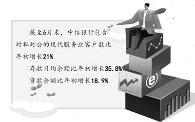 2013年上半年,中信银行总行在公司银行部下设现代服务业金融部,在总、分行设立现代服务业金融工作小组。截至6月末,该行包含对私对公的现代服务业客户数比年初增长21%;存款日均余额比年初增长35.8%;贷款余额比年初增长18.9%,现代服务业开局良好。