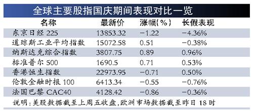 受美国政府关门等因素影响,全球主要股指在中国长假期间表现不佳,日经225指数表现最差,在长假期间,该指数跌幅为4.36%。 “从全球股市来看,虽然政府关门有一定的负面影响,但股指还是比较稳定,没有出现恐慌。”一位基金市场策略分析师告诉记者。