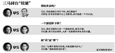 早在众安保险获批筹建之时,“三马”之间的竞争就已经成为业界关注的焦点,特别是马云领军的阿里和马明哲领军的平安之间迟早会出现的竞争。而这股竞争的硝烟也传到了昨日的开业仪式现场,三位刚刚宣布合作的商界“大佬”,在寒暄的同时,也在现场拉开架势,探讨起今后的竞争局面。