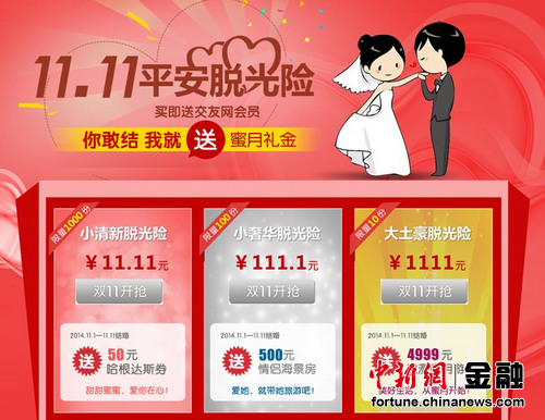 继中秋“赏月险”之后,又有吸引眼球的“脱光险”热辣辣出炉。昨日,羊城晚报记者获悉,平安产险针对单身人群推出一款“脱光险”,鼓励单身青年寻找爱情,购买了这款产品的消费者若是一年后结婚即可获得最高4999元的蜜月礼金。