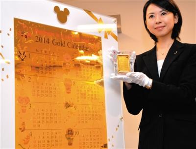 日本东京当地时间12月3日,为纪念12月3日“年历之日”,日本一家著名珠宝贵金属厂商在东京银座举行记者会,首次公开亮相了经迪斯尼-日本授权的“迪斯尼纯金2014年历”,该年历高80厘米、宽50厘米,以拼图形式,使用了10公斤24K黄金,售价1亿日元(约合593万元人民币)。只此一件,即日起公开出售。图/CFP