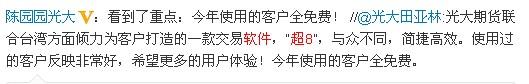 根据记者调查,爆料人所称的“超8”交易软件是光大期货与台湾公司合作开发的产品,在2012年8月份时光大期货就曾大力推广过该软件。为此,光大期货当时还专门在各地营业部组织了大量培训会、体验等活动。光大期货总经理田亚林当时也在微博中宣称:“光大期货联合台湾方面倾力为客户打造的一款交易软件,“超8”,与众不同,简捷高效。使用过的客户反映非常好,希望更多的用户体验!今年使用的客户全免费。”而光大期货北京总经理陈园园也紧随其后,利用回帖再次强调了“今年使用的客户全免费”这一重点。而在将近一年半以后的2013年12月3日,当记者电话咨询光大期货北京营业部时,工作人员称目前使用“超8”软件仍然是免费的。