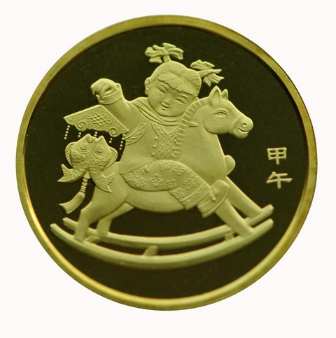 该普通纪念币正面刊“中国人民银行”、“1元”、汉语拼音字母“YIYUAN”及年号“2014”;背面图案为一个手持寓意“吉庆有余”挂件的小女孩骑在木马上,其右方刊“甲午”字样。