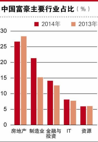 再来看看中国的情况:尽管“造富机器”IPO于2013年暂停,中国富豪的数量仍然增加了41位,共计358位,仅次于美国的481位。值得一提的是,地产依旧是最具造富能力的行业,26.7%的入榜富豪正是从事房地产生意,紧随其后的是制造业和金融业。