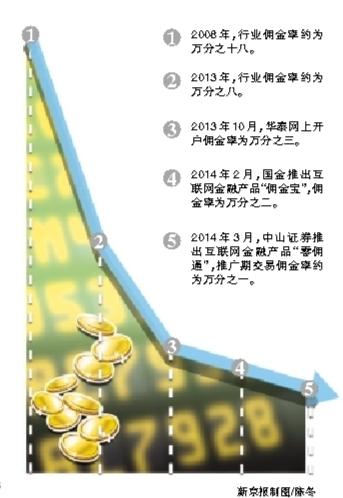“佣金宝”的低佣金率触动了市场的神经。实际上,在“佣金宝”面世之前,华泰证券从去年底就已经开始进行“万三”佣金的布局,为吸引投资者进驻,华泰证券推出的网上开户政策中,实行了万分之三的交易佣金策略。华泰证券这种做法率先打破了券商的“万八”佣金联盟。从平均水平来看,2008年经纪业务的佣金率约为0.18%(万分之十八),2013年则下降至0.08%(万分之八)。