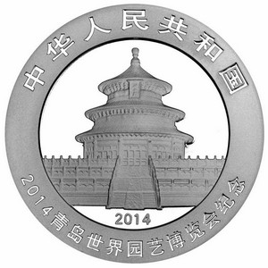 31.104克(1盎司)圆形银质纪念币背面图案为熊猫嬉戏图,并刊“1oz Ag .999”字样、“2014青岛世界园艺博览会纪念”英文字样及面额。