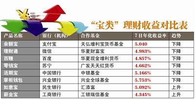 “余额宝刚上线时7日年化收益率高达6.343%,现在收益率已降到5.0%左右了,还不如银行卖的理财产品高呢!”昨日,家住新区的赵女士告诉记者,我现在已经把“大头”10万元拿出来重新购买银行理财产品了。记者发现,近来,由于市场上资金相对宽松,货币基金收益率普遍下挫,除互联网理财产品外,银行宝类产品7日年化收益率也普遍下滑。比如“余额宝”险守5%,为5.023%。“理财通”的4款“宝宝”产品更是全部跌破5%,四款产品中收益率最高的为华夏基金财富宝,最近7日年化率为4.931%。