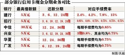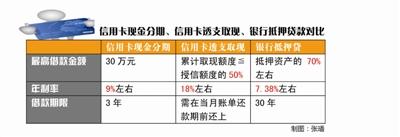 目前建行、招行、中信、兴业、华夏等多家银行均推出了信用卡现金分期业务,这项业务都被赋予了“无抵押、无担保、快速、小额资金需求”等特点。与信用卡透支取现不同,该业务则是银行将申请获批的资金一次性转到客户名下的储蓄卡中,且不收取利息,但会按资金使用的期限按既定比例收取手续费。在不同银行客户可套取的现金额度也不同,建行、招行、兴业等普遍最高5万元,中信银行最高可达30万元。同时,各银行现金分期的手续费率和期限也各异,期限最长达36期。记者对比发现,通过信用卡现金分期的融资成本比信用卡透支取现便宜,但比普通的抵押贷款要贵。信用卡透支取现每天的利息为万分之五,折合成一年的利率即18%,而现金分期的手续费就要低得多;目前银行一年期消费类贷款基准利率为6.15%,而银行通常会上浮20%,上浮后利率为7.38%,低于信用现金分期的年息。