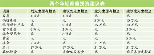 两个家庭相比较,都有供房压力,但龙先生家的稳定性更强,理财思路更应偏重于中长线,不妨增加定投基金、黄金等;而刘先生家的理财灵活性较强,可采用中短线理财思路,不必在保守理财品上投入过多的资金。