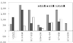 伴随资金面乍起微澜,央行放水安抚市场情绪的力度也相应加大。12日,央行在公开市场开展400亿元28天期正回购操作,中标利率继续持稳于4.00%。据WIND统计,本周公开市场共计到期资金1840亿元,扣除周二、周四合计800亿元正回购操作后,全周实现净投放1040亿元,较上周的730亿元明显放大。至此,央行公开市场操作自5月中旬以来已连续五周净投放。