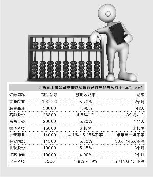 据证券时报记者不完全统计,仅7月1日、2日两天,沪深两市共有27家公司披露投资理财产品的公告,6月底累计购买银行理财产品的总金额约30.57亿元。从上述公司购买理财产品明细来看,上市公司偏好3个月期限的银行理财产品,且预期年化收益率普遍在4.5%至5.5%之间。
