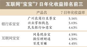 昨日,最新的数据显示,余额宝7日年化收益率在4.1910%,而大多银行系“宝宝”收益率在4.5%甚至达到5%左右,如中银“活期宝”、民生“如意宝”、兴业“掌柜钱包”7日年化收益率分别是4.4810%、4.6270%、5.0310%。