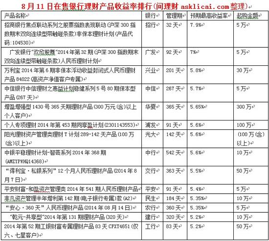 另外,部分银行虽然当天在售的理财产品收益率比上述榜单的产品更高,但由于招募期较长,到8月11日份额已销售完,因此并不在上述可在售的榜单中。(来源:问理财网)