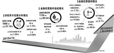 2013年1月至2014年6月,上海法院共收涉信用卡犯罪一审案件1735件,涉及被告人1806人。其中,窃取信用卡信息罪1件3人,妨害信用卡管理罪30件87人,信用卡诈骗罪1686件1731人,以非法经营罪处理的利用POS机非法套现犯罪案件18件29人。