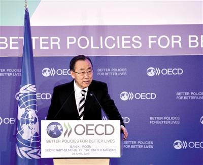 4月28日,联合国秘书长潘基文在经济合作与发展组织位于巴黎的总部发表演讲。潘基文表示,现有的国际投融资机制已难以满足各国可持续发展需要,国际社会应加强合作,争取达成新的协议,以改善现有的国际投融资机制,促进可持续发展。新华社记者 韩冰 摄