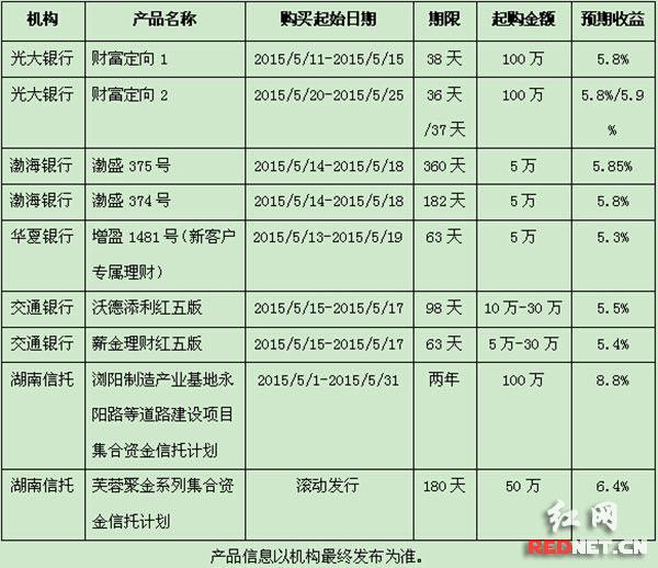 15日,长沙多家银行的理财经理向时刻新闻记者表示,大多数理财产品的收益均与降息前基本持平。同时,在货币市场逐渐宽松的大背景下,本土华融湘江等银行在本周发行了预期收益率过6%的理财产品,受到了投资者的广泛关注。融360理财专家分析五月银行理财走势时曾表示,收益逐渐下行是大势所趋,但本月银行理财的收益并不见得会立即“跳水”,如若遇见收益破6%的理财产品,投资者可根据个人需要尽早购买。