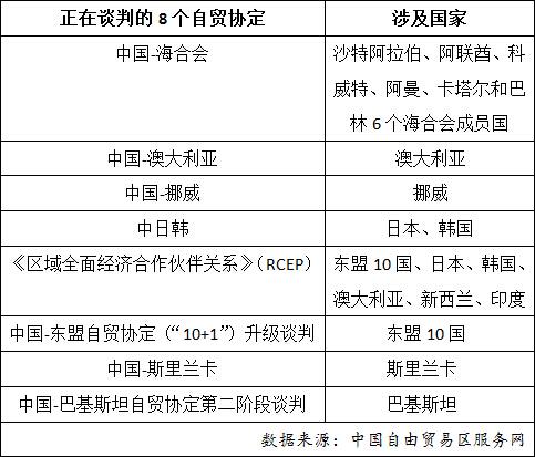 “中国对外商谈自由贸易协定总体情况”还显示,我国正在谈判的自贸协定8个,涉及23个国家,分别是中国与海湾合作委员会(GCC)、澳大利亚、斯里兰卡和挪威的自贸协定,以及中日韩自贸协定、《区域全面经济合作伙伴关系》(RCEP)协定和中国-东盟自贸协定(“10+1”)升级谈判、中国-巴基斯坦自贸协定第二阶段谈判。